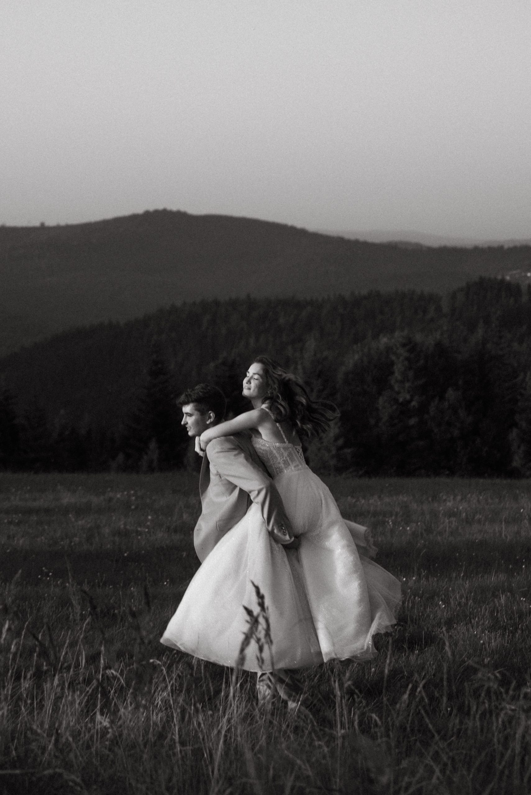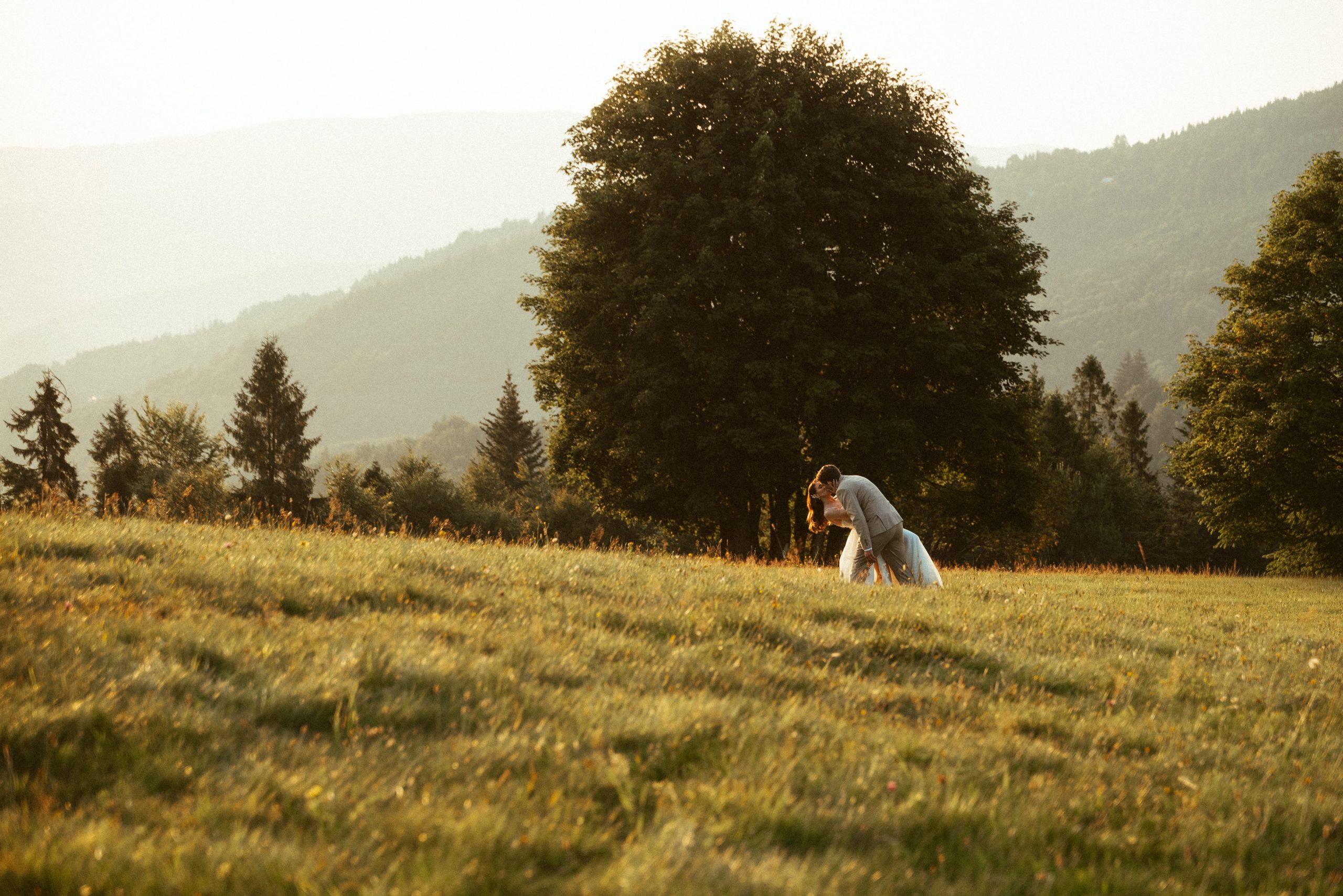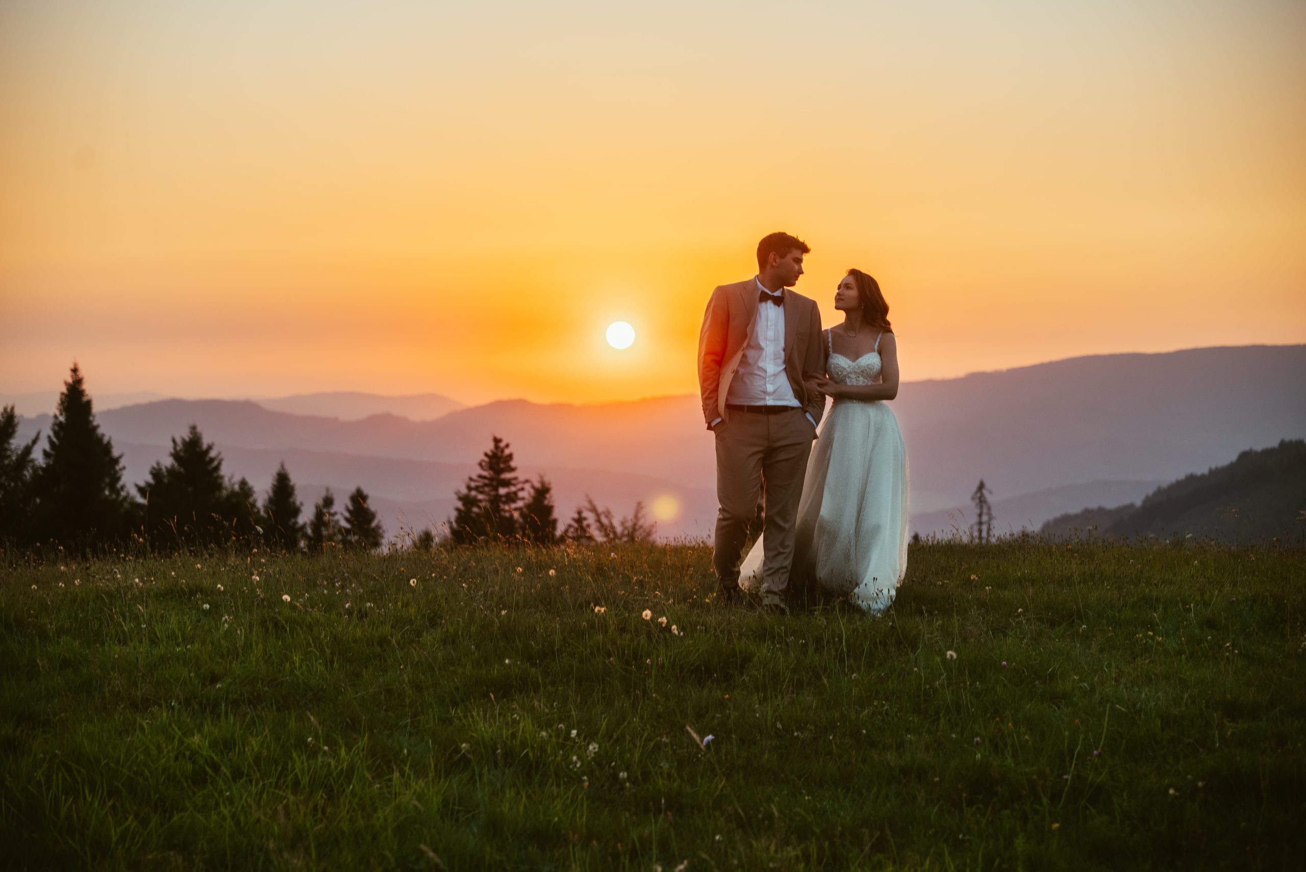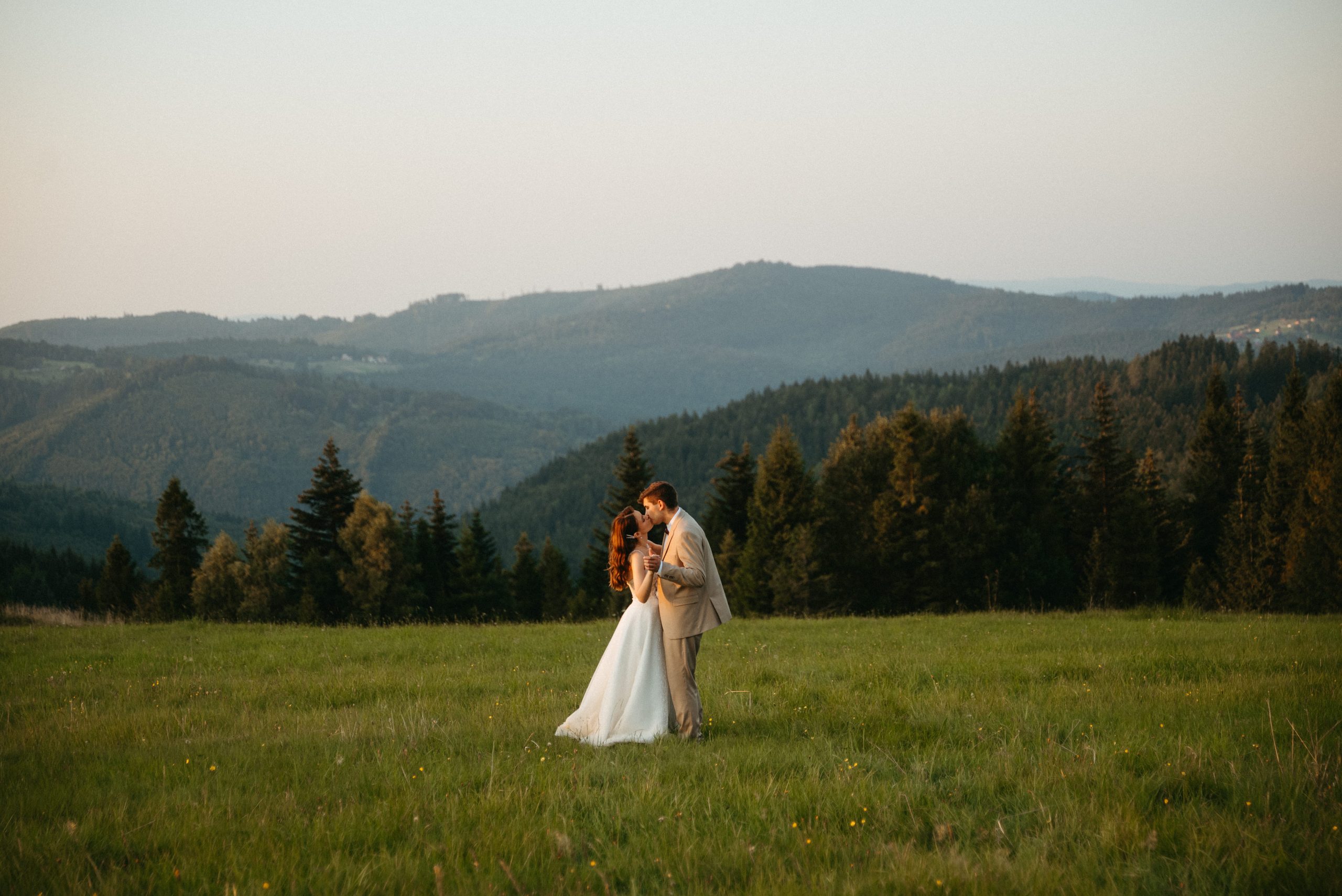 Góry dają przestrzeń. Dosłownie i symbolicznie. Pozwalają wyjść poza codzienność, odciąć się od hałasu i skupić na tym, co najważniejsze — na relacji. W Beskidach wszystko dzieje się naturalnie: wiatr porusza suknią, światło miękko opada na twarze, a zachód słońca tworzy spektakl, którego nie da się powtórzyć ani zaplanować co do minuty. Każda górska sesja jest inna, niepowtarzalna, zależna od pory dnia, pogody i emocji, które para wnosi ze sobą.