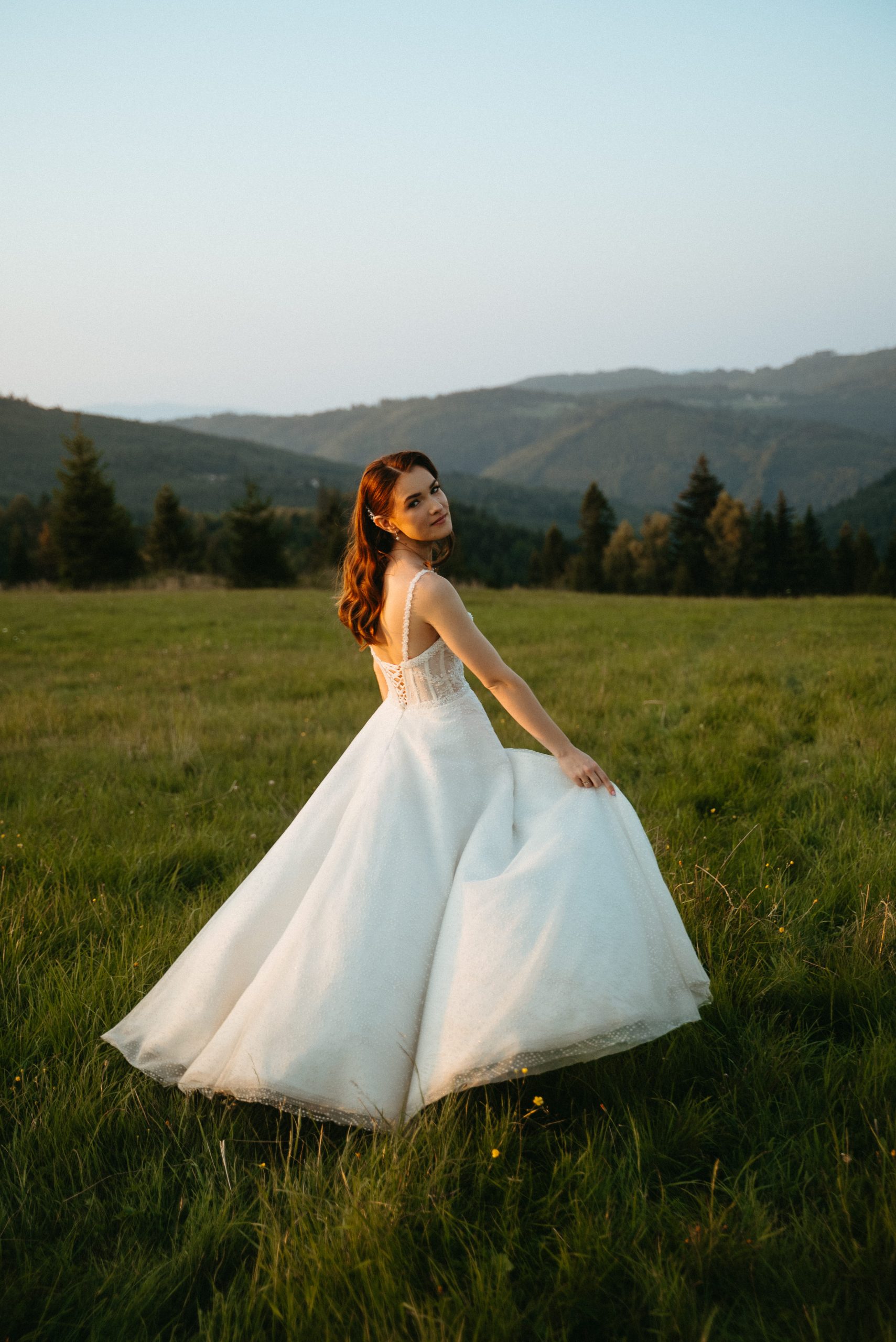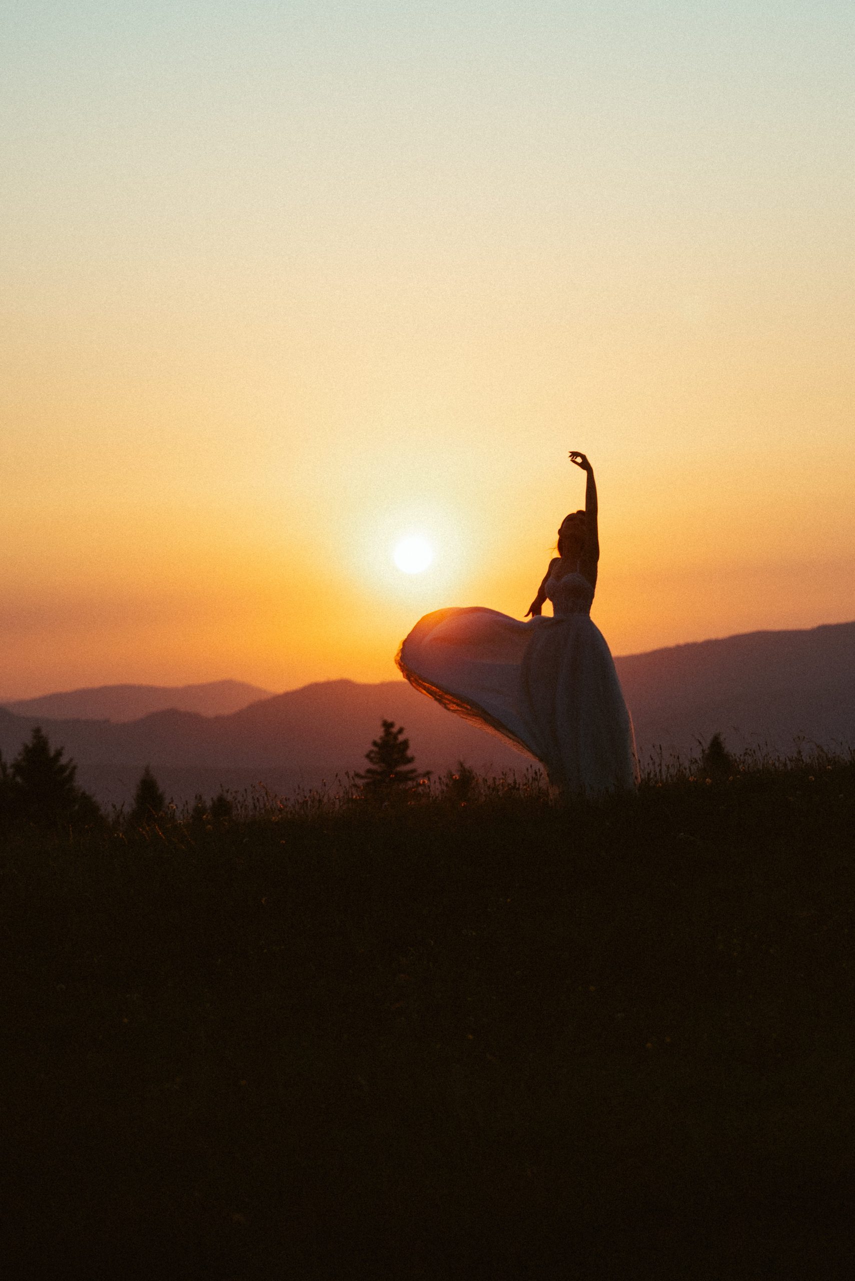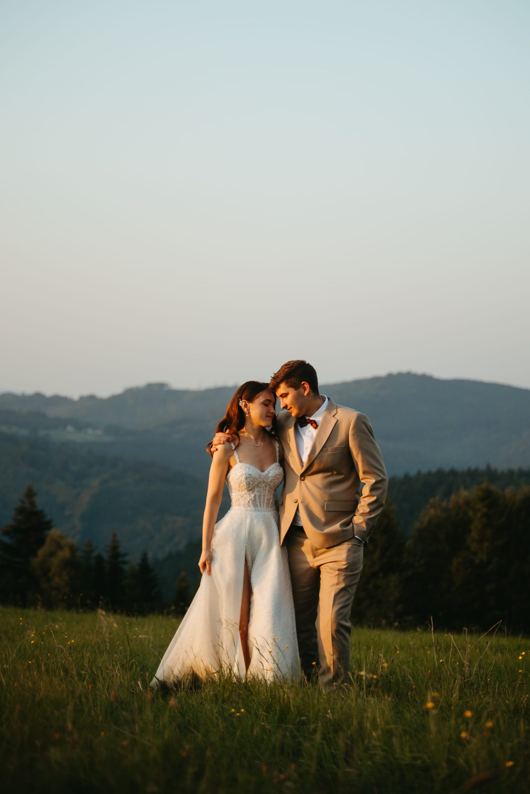 Góry dają przestrzeń. Dosłownie i symbolicznie. Pozwalają wyjść poza codzienność, odciąć się od hałasu i skupić na tym, co najważniejsze — na relacji. W Beskidach wszystko dzieje się naturalnie: wiatr porusza suknią, światło miękko opada na twarze, a zachód słońca tworzy spektakl, którego nie da się powtórzyć ani zaplanować co do minuty. Każda górska sesja jest inna, niepowtarzalna, zależna od pory dnia, pogody i emocji, które para wnosi ze sobą.